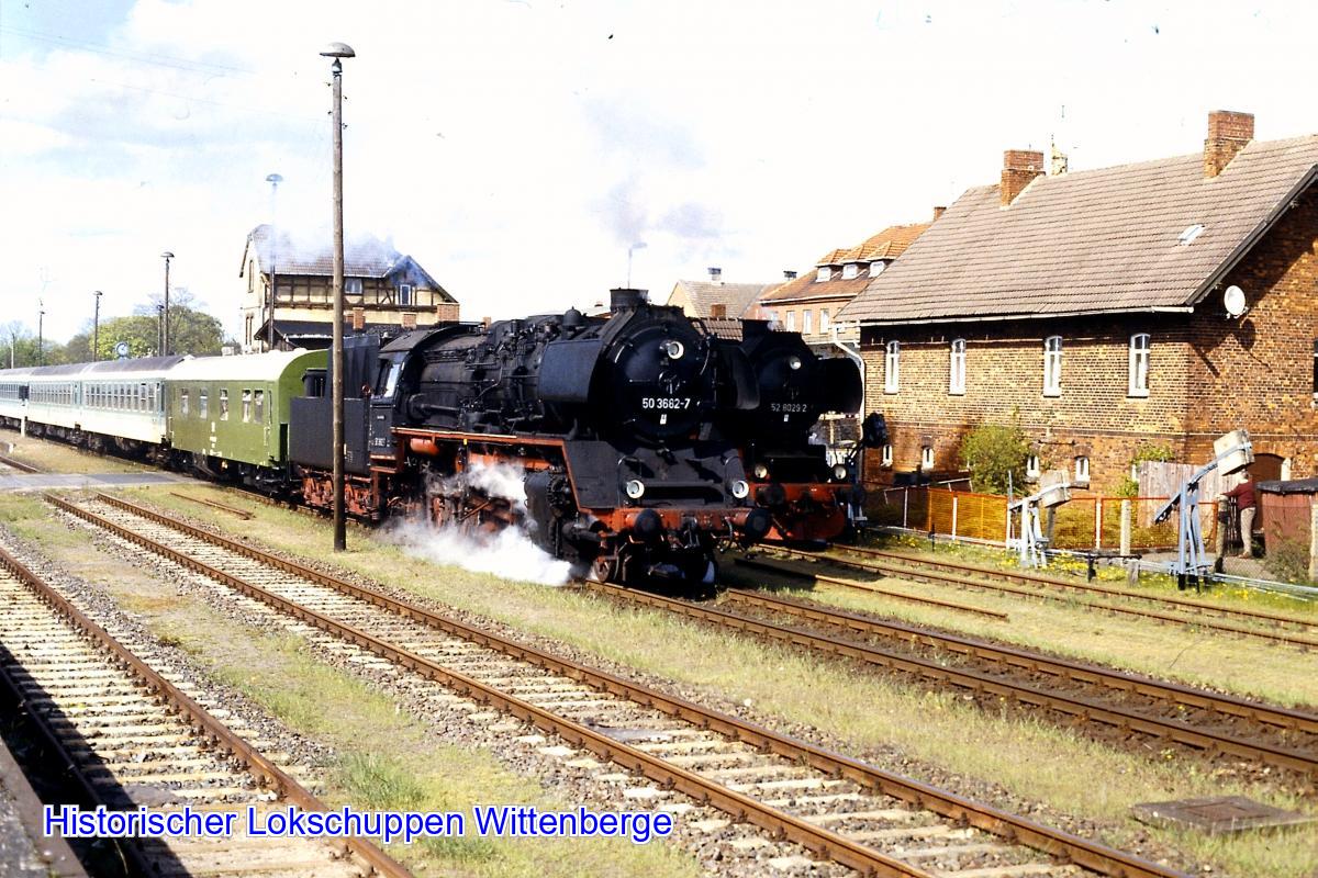 ![]() 30 years of Dampflokfreunde Salzwedel e.V. - Memories On 30 April 2000, three of our exhibits basked in the sun in front of the locomotive shed in Salzwedel. 52 8131 has since left us and belonged to the company WFL Wedler Franz Logistik GmbH, which has since restored the locomotive to working order. The locomotive was sold to the Lausitzer Dampflokclub in 2020. The other two locomotives, 50 3624 and 3682, are still part of the collection in Wittenberge. |