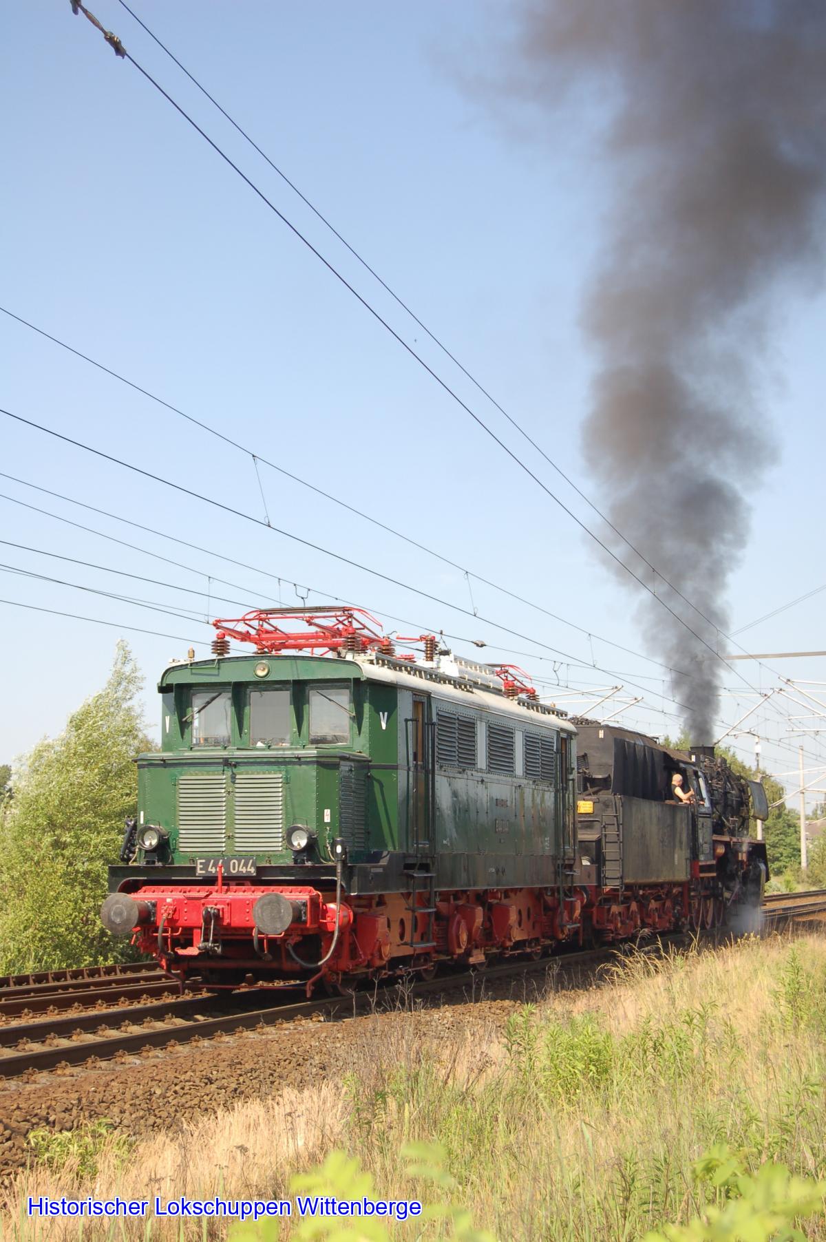 ![]() 30 years of Dampflokfreunde Salzwedel e.V. - Memories The Hanseatic Festival was celebrated in Salzwedel at the beginning of June 2008. Reason enough for us to invite some guest vehicles to Salzwedel. Here we see the electric locomotive E44 044 from Dessau being towed into our museum by our steam locomotive 50 3682. |