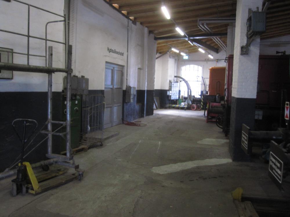 This photograph show the rear of the shed and in the wall a double-door is visible which was earlier the entrance to the hydraulic workshop. When the shed was open, hydraulic units from locomotives, excavators and mechanical handling equipment were maintained. The window which can be seen in the background divides off the shed's own carpenter's workshop from the loco shed.