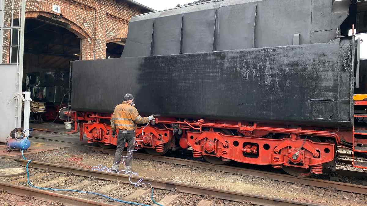 First, the steam locomotive 50 3570 was spray-painted. Fortunately, the weather was dry and windless during the last days, so that the paint could be sprayed under the open sky.