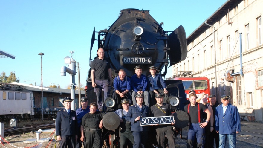 Schnell noch ein Abschiedsfoto mit einigen Vereinsmitgliedern: Bei der Dampflok 50 3570-4 steht für unabsehbare Zeit die Fahrwerks-Hauptuntersuchung an. |