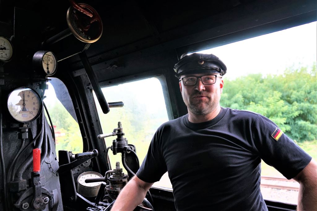 Dennis Kathke fuhr Besucher im Führerstand einer Dampflok der Baureihe 50 über das Gelände.