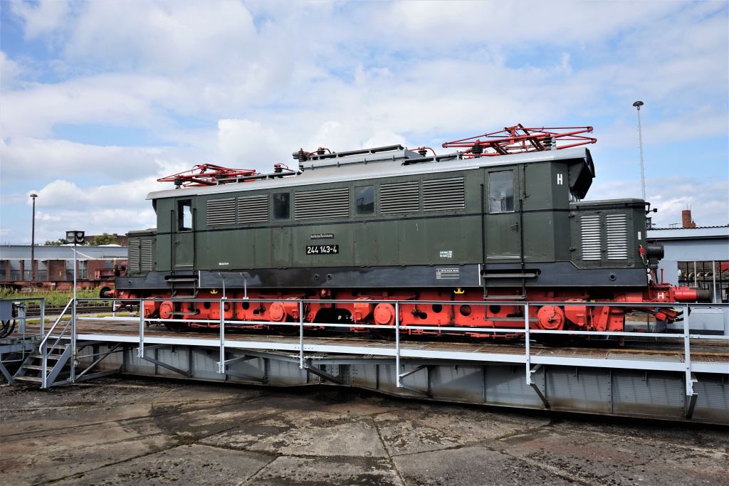 Eine Elektrolokomotive auf der Drehscheibe.