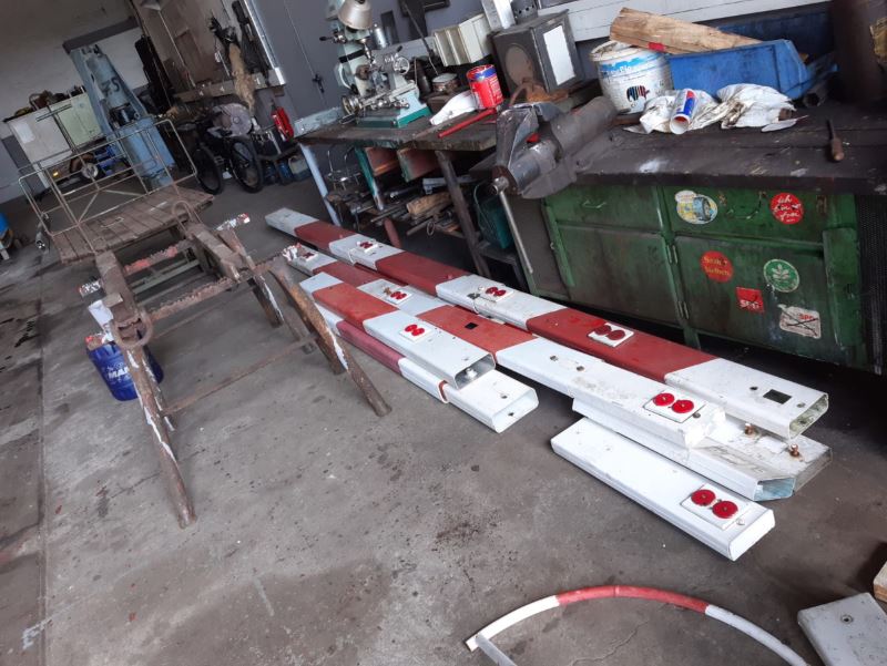 Die nächsten beiden Bilder zeigen einen Schrankenbock, der den elektrischen Antrieb für eine Schranke enthält, und einige der rot-weiß schraffierten Schrankenbäume in unserer Werkstatt.
