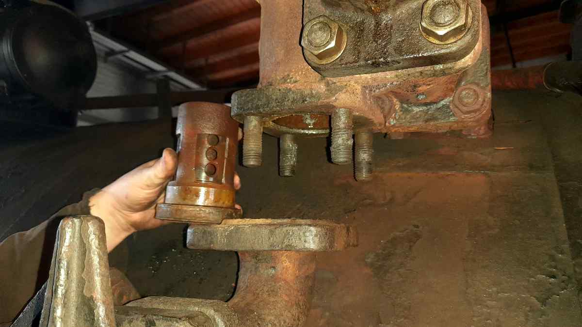 At 50 3570, the check valves have been removed. They are used to seal the lines through which fresh water can be fed into the boiler during operation. The valves consist of two parts: On the one hand, a housing with a sealing edge in it, and on the other hand, the actual valve body. The latter converges conically at the end and is pressed against the seat in the housing by the steam pressure in the boiler. If a pump is now turned on, the valve body is lifted out of the seat by the pump pressure and water can flow through the gap. The parts are made of brass to prevent them from rusting. However, brass is a relatively soft metal. Thus, closing the valve can cause a furrow to form in the valve body when it is pressed back onto the seat. This will cause the valve to leak over time. Valve bodies and seats must therefore be regularly reworked on the lathe. Here are a few pictures of the removal and machining of a valve and a comparison before and after machining.