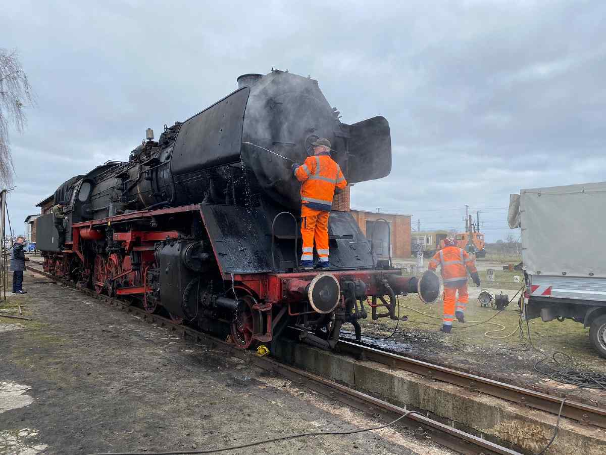 An diesem Wochenende haben wir Emma schon auf ihren nächsten Einsatz vorbereitet und alle Betriebsstoffe ergänzt. Außerdem haben mittels Druckluft die Kesselrohre von Staub und Ruß befreit, durch die die heiße Luft von der Feuerkiste in Richtung Rauchkammer strömt. Da lagern sich bei jedem Einsatz immer wieder Verbrennungsrückstände ab und behindern die Wärmeübertragung in den Kessel. Nach ihrer Behandlung macht sie bestimmt wieder viel Dampf.