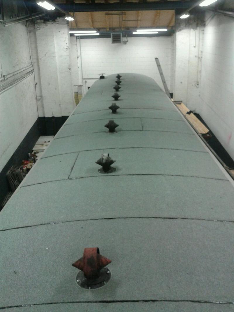 Am 20.2.2016 haben wir das Dach des Beiwagens VB 197 805 neu eingedeckt. In den Wochen zuvor war die Holzunterkonstruktion teilweise erneuert worden. Nun konnten wir zunächst eine neue Trennlage aus Dachpappe aufbringen, danach die Decklage. Zuletzt wurden die Dachlüfter und der Schornstein der Ofenanlage eingesetzt. Als nächstes werden die Einfassung der Lüfter mit Dachpappe abgedichtet und die Kantenleisten befestigt, welche die Dachpappe nach außen dauerhaft an den Seiten festhält. Dann ist zumindest das Dach des Wagens wieder in einwandfreiem Zustand. Außerdem konnten wir bereits einen Teil der Elektrik für die Beleuchtung erneuern.