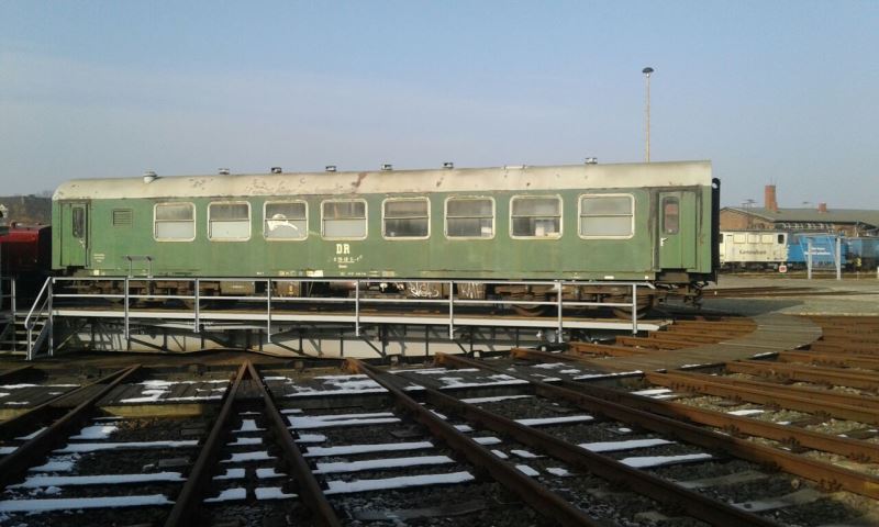 The car has four sleeping compartments with double bunk beds, a lounge, a small kitchen and a bathroom with toilet and shower. The car can be heated with steam from the locomotive, with its own coal stove or electrically. While tThe substance is still sound, vandalism and bad weather have taken their toll of it in recent years. The active members of the association will repaint it in the near future and replace the broken windows. In addition, the electrical system is currently being overhauled. Afterwards the heating and the interior fittings will be renewed so that it can serve as accommodation in Wittenberge for active members travelling from further afield.