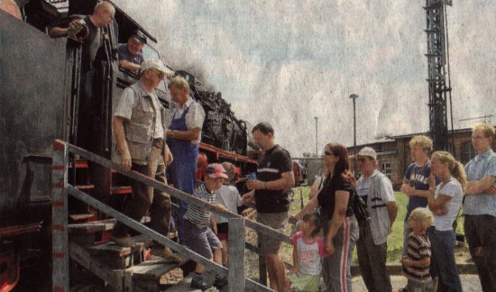 Salzwedel Es dampfte und zischte, stampfte und pfiff. Kleine Kinder machten große Augen - und große Männer irgendwie auch. Der alte Traum, Lokführer zu werden, stand so manch einem ins Gesicht geschrieben. Die Dampflokfreunde hatten für ihre Gäste die liebevoll "schwarze Lady" genannte Lok 503682, Baujahr 1939, bereitgestellt - und die alte Dame fuhr dann auch gemächlich zwischen Lokschuppen und Bahnhof hin und her, das Führerhaus voll mit Kindern und Erwachsenen, die trotz der Hitze in der kohlebefeuerten Lok fröhliche Gesichter machten. Lokführer Ulrich Winterberg fuhr das Ungetüm, Heizer Karsten Lanzke hielt es unter Dampf. Auch eine zweite Dampflok kam zum Einsatz: Ein rumänisches Exemplar aus den 1940er Jahren.![]() Viele Gäste wollen sich die Fahrt auf der Dampflok nicht entgehen lassen. |